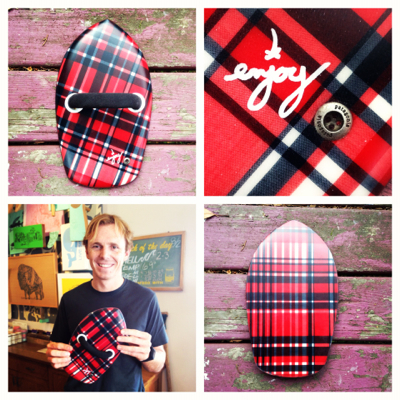 Roy Coffman manger of Patagonia Cardiff with his new handplane made from an old Patagonia plaid shirt, complete with button inlay. Roy is a huge supporter and now gets to get barreled in the name of product testing. Someone's got to do it right?